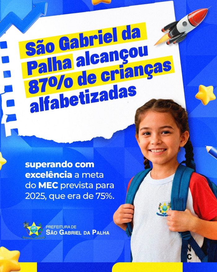 São Gabriel da Palha, ES — O município de São Gabriel da Palha registrou um avanço histórico nos índices de educação básica. Segundo dados do Instituto Nacional de Estudos e Pesquisas Educacionais Anísio Teixeira (Inep), divulgados nesta quarta-feira (8), a cidade atingiu o índice de 87% de crianças alfabetizadas em 2025, superando com folga a meta prevista de 75%.