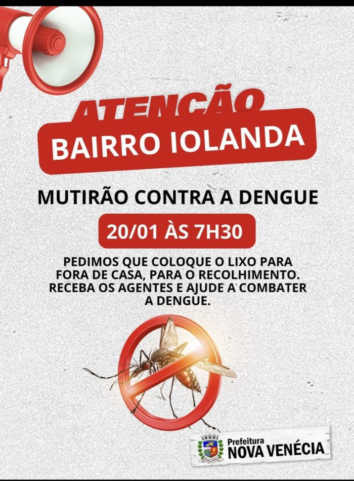 A Prefeitura de Nova Venécia realiza, nesta terça-feira (20), a partir das 7h30, um mutirão de combate à dengue no bairro Iolanda. A ação faz parte das estratégias do município para intensificar a prevenção e reduzir os focos do mosquito Aedes aegypti, transmissor da dengue.